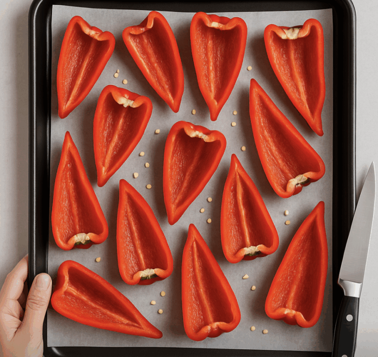 - Paprika vorbereiten: Die Spitzpaprika waschen. Längs halbieren und das Kerngehäuse sowie die weißen Trennwände entfernen. Die Paprikahälften auf ein mit Backpapier ausgelegtes Backblech legen.